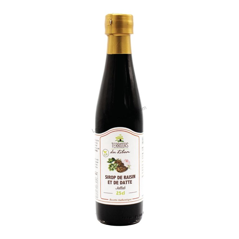 Originaire du Moyen-Orient, le sirop de raisin et de datte « Jallab » est réalisée à partir de mélasse de datte, de mélasse de raisin et d’eau de rose, le tout fumé à l’encens naturel. Le « Jellab » est à la fois le nom de la boisson et du sirop avec lequel elle est préparée. Pour un pur moment de gourmandise, on l’agrémente d’amandes effilées, de pignons, de pistaches, de raisins secs et on la déguste avec une petite cuillère pour manger facilement les fruits secs. Il peut également servir de coulis avec les desserts lactés ou les gâteaux secs et accompagner vos cocktails. Élaboré par la coopérative agricole des femmes de Fourzol dans la vallée de la Békaa, notre sirop de raisin et de datte « Jallab » est fabriqué à partir de mélasses produites par la même coopérative située dans les plaines de la Békaa, une région qui est surtout réputée pour son climat idéal pour la culture de vignobles.